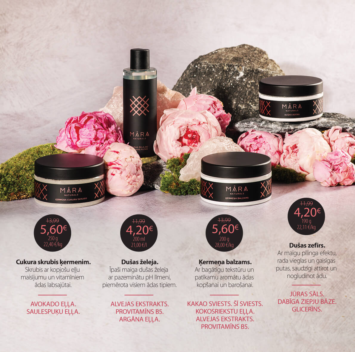 Radīta, iedvesmojoties no pavasara atmodas Latvijas dabā, kad viss plaukst un elpo ar jaunu spēku. Šie ir produkti, kuros dabas maigums apvienots ar efektīvu ādas kopšanu. Maigas tekstūras, dabiski aromāti un patīkamas sajūtas, piešķirs Tavai ādai dzīvības pilnu starojumu.