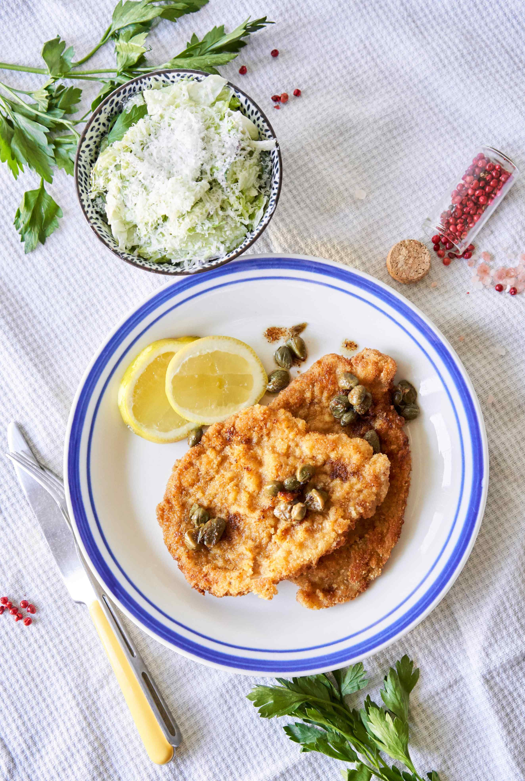 - Baudi šniceles, pārkaisot ar nedaudz saspaidītiem kaperiem un pasniedzot kopā ar salātiem, un citrona šķēlīti.