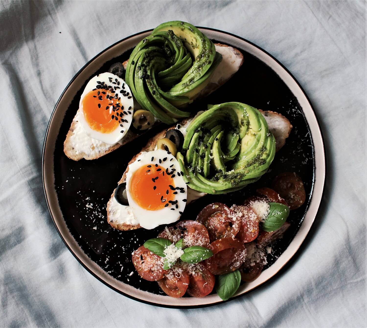 Avokado sagriež plānās šķēlītēs. Pilngraudu maizi apgrauzdē tosterī, uzsmērē uz maizes krēmsieru, liek virsū avokado un pārlej maizītes ar iegūto pesto mērci. Uz maizītes vai tai blakus uz šķīvja liek uz pusēm pārgrieztu vārītu olu. Maizītes rotā ar sezama sēklām, parmezāna sieru, bazilika lapām un pasniedz, kamēr maizīte silta.