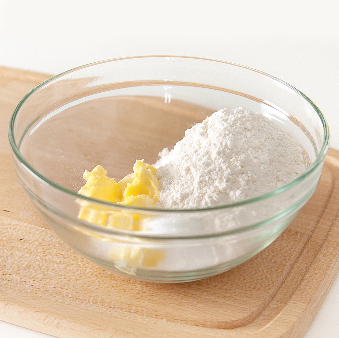 - Bļodā liek mīkstu sviestu (istabas temperatūrā), miltus un cukuru, pieber šķipsnu sāls