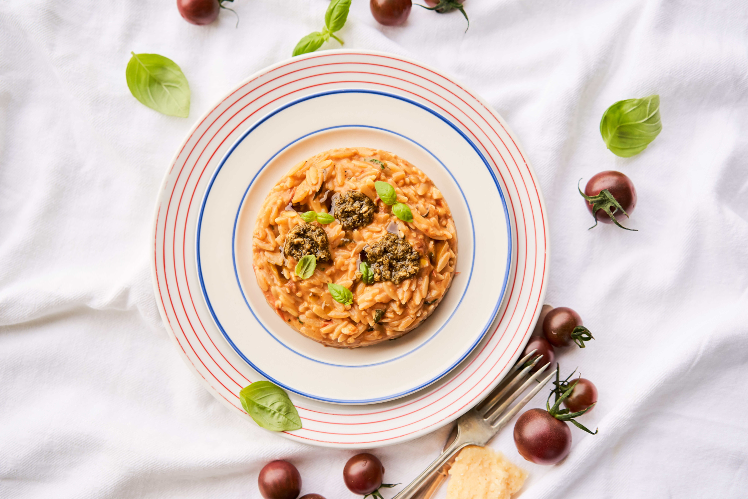 - Pasniedz, rotājot ar bazilika lapām, pesto un šķipsniņu rīvēta cietā sieru.