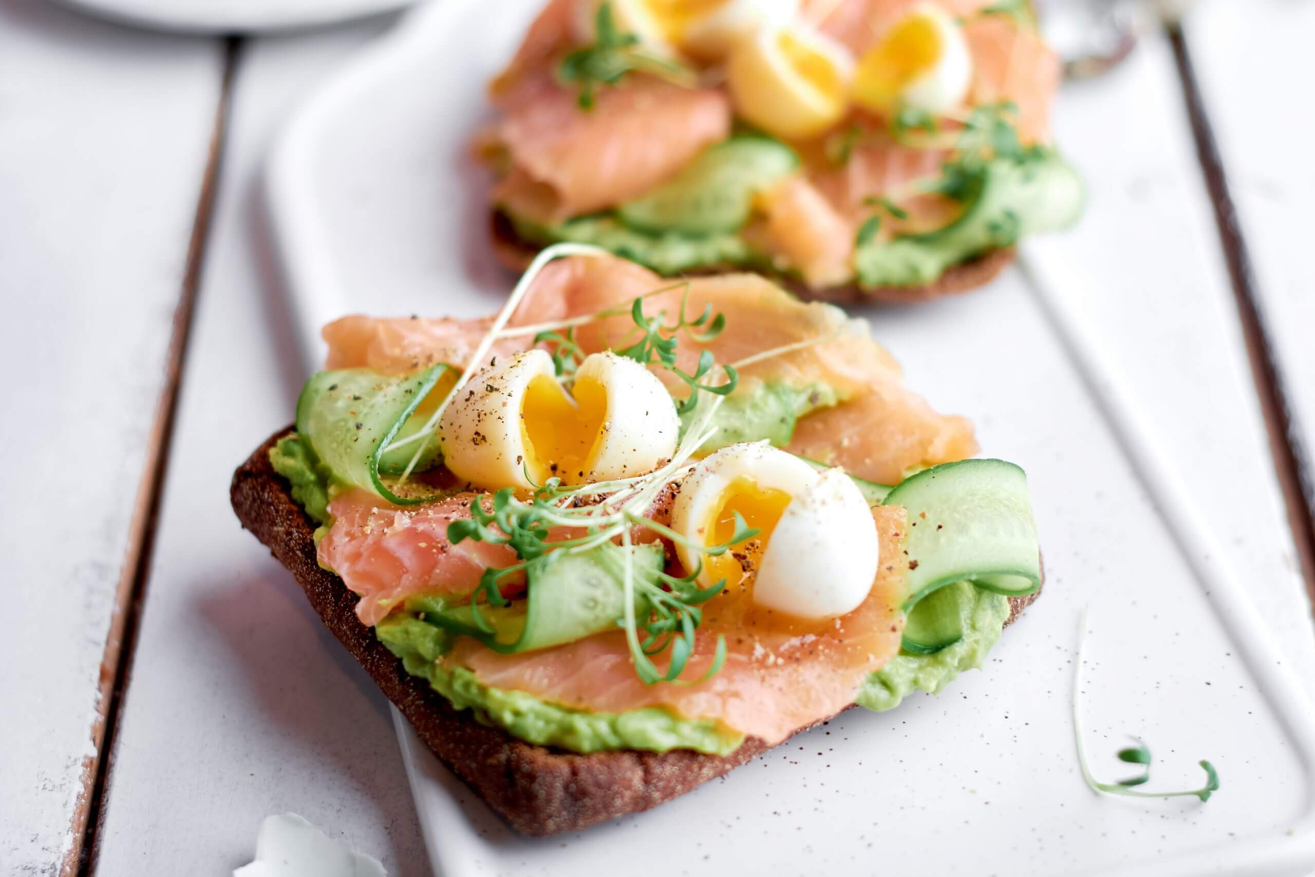 Sagrieziet plānās šķēlītēs zivi. Notīriet un ar dakšiņu samīciet avokado, lai veidojas krēmīgs “avokado sviests” (tajā var palikt arī lielāki avokado gabali). Pievienojiet avokado masai nedaudz sāls. Uzsmērējiet to uz maizītēm, lieciet virsū lasi un gurķi, pa virsu uzliekot sagrieztas, vārītas olas. Pārkaisiet ar garšvielām, rotājiet ar zaļumiem un pasniedziet!