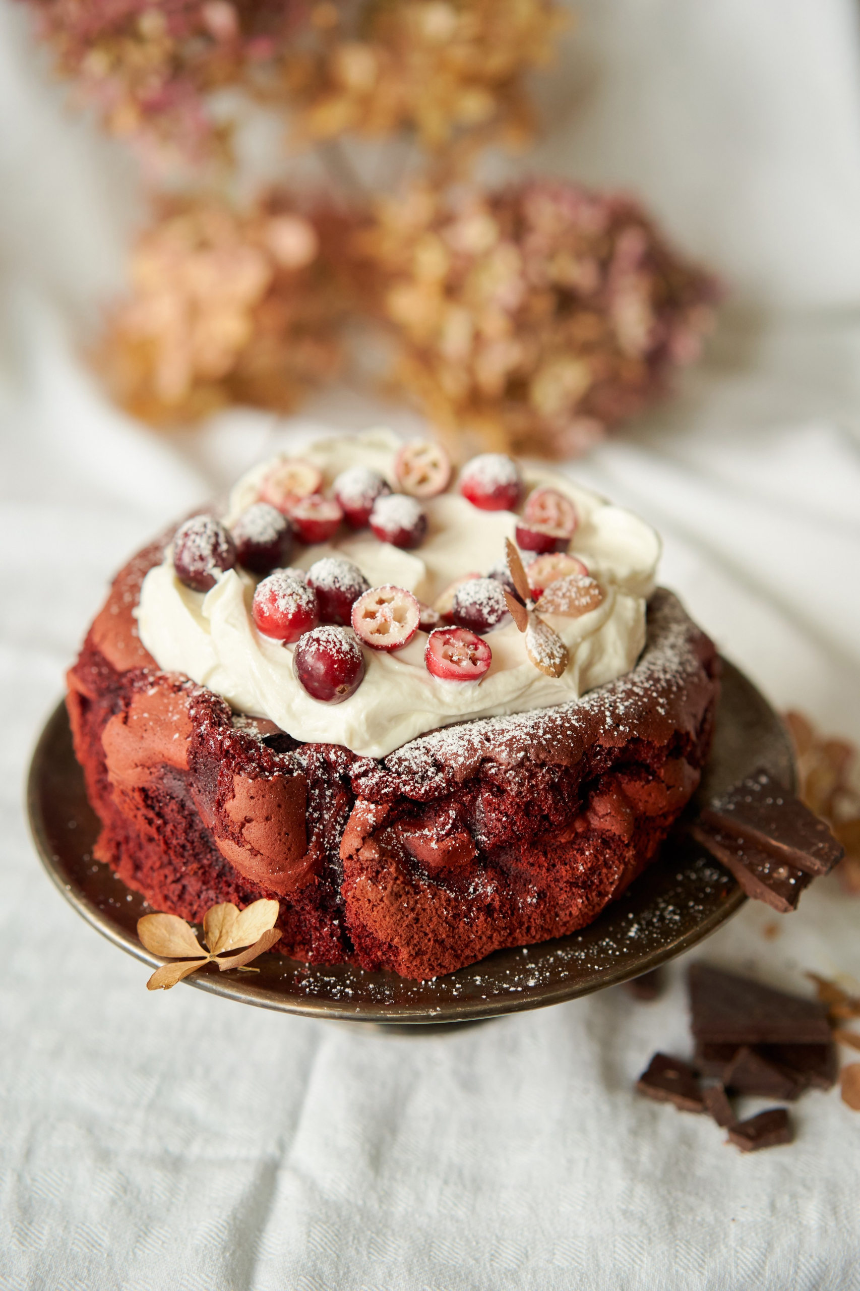 - Smērē jogurta krēmu uz atdzesētas kūkas, rotā ar dzērvenēm, granātābola sēklām vai citām sarkanām ogām, apkaisi ar pūdercukuru un pasniedz.