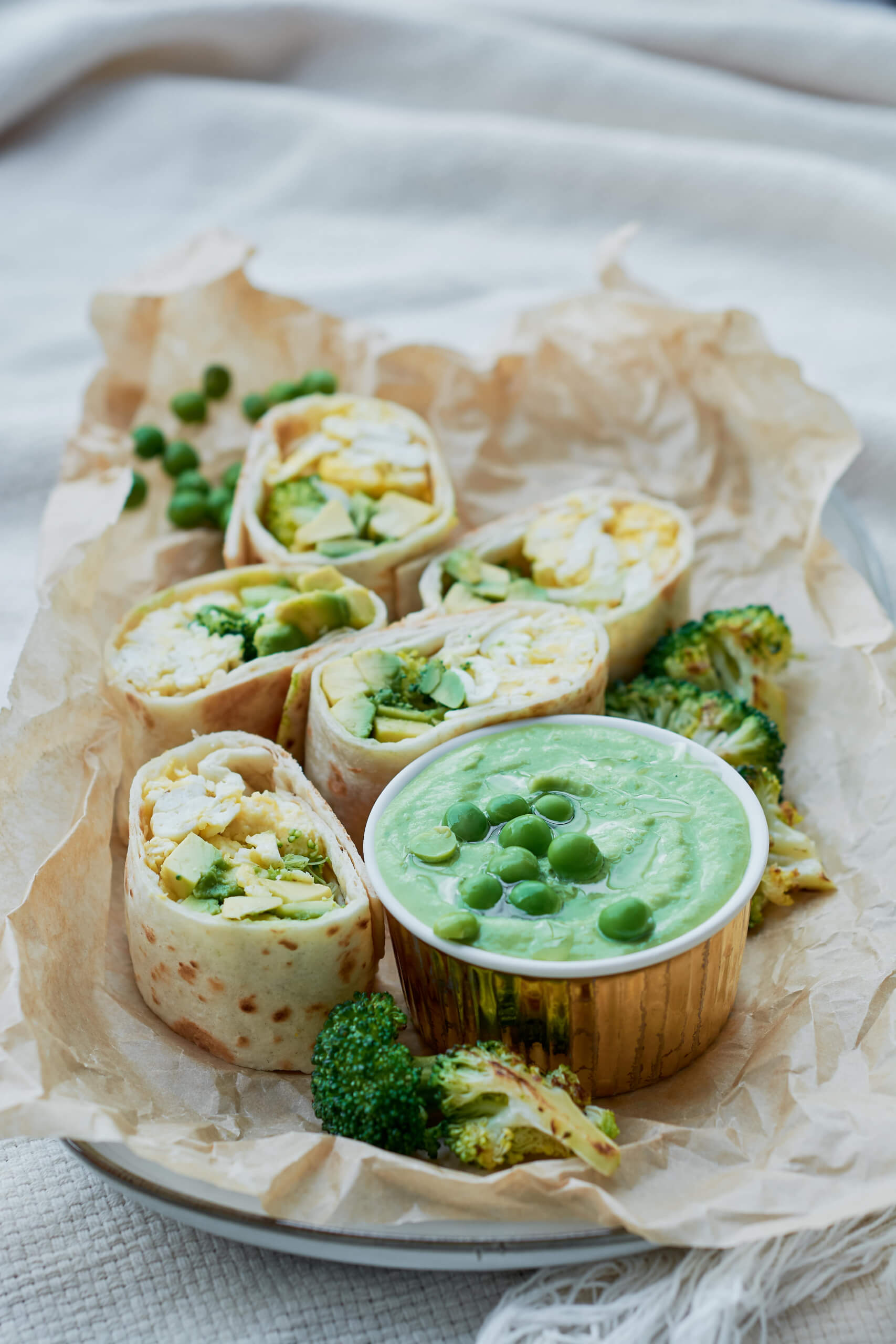 - Katru tortilju uzsildiet uz pannas aptuveni 20 sekundes. Uzklājiet uz tām olu kulteni, brokoļus, avokado un nedaudz zaļo zirnīšu mērces. Salokiet tortiljas!